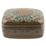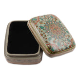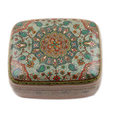 Designed by Indian artisan Niyaz, this petite box was inspired by Persian carpets. The velvet-lined box is crafted of kail wood and covered with papier mache before being carefully painted by hand with lavish floral motifs. The artisan uses poster paints as well as pigments derived from natural flowers.