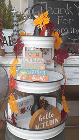 3-tiered serving tray. Crafted with a white enamel finish and adorned with a charming blue trim, this decorative tray is not only functional but also adds a pop of color to your living space. It's perfect for serving, display, or as a unique piece of home decor. Water tight and food safe, this tray is as practical as it is stylish.