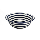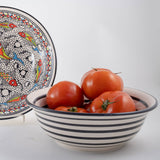 Earthenware material Freehand painted with food-safe paint and glaze Microwave and dishwasher safe This exquisite bowl is produced by the Tunisian artisan studio, over a dozen artisans meticulously hand-paint each line, dot, and stroke of glaze onto the white clay dishes.