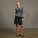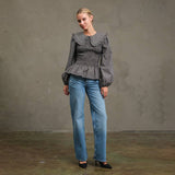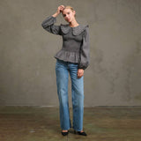 The Peter Pan collar and check pattern create a delightfully retro aesthetic that's both timeless and fresh. The ruffled collar detail and puff sleeves add romantic femininity while maintaining a sophisticated, polished look.