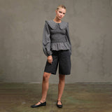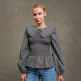 This beautifully crafted blouse combines the classic appeal of check patterns with the sweet sophistication of a Peter Pan collar and feminine details. Made from 100% cotton, this piece brings both comfort and vintage-inspired style to your wardrobe with its flattering smocked body and charming design elements.