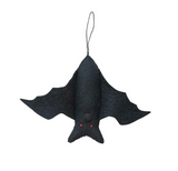 This small handmade bat ornament is a cozy and fuzzy decoration for Halloween, featuring a black face with two pointy ears and two red eyes. It is made from wool felt and comes with a black string for vertical hanging. The ornament can be used to decorate doors, windows, walls, or fireplaces, or as a gift for friends and family. Each unique piece varies slightly in shape, size, and color, making it a special piece. Measuring 7.5 inches in length, and 4.5 inches in height, it is a must-have for any Halloween lover. The unique piece varies slightly in shape, size, and color, making it a must-have for any Halloween enthusiast.