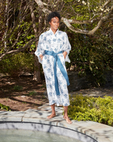 Echoing the graceful form of a traditional kimono, the Rubia Robe offers relaxed everyday luxury. Featuring a Schumacher floral, it’s crafted in Portugal from cool linen and styled with a beautiful cocoon-like drape. This robe is completed with a double-layered belt in a coordinating shade of deep blue, flattering side pockets and flowing ¾-length sleeves. Rubia is offered in one size that fits most, making it an ideal gift.