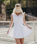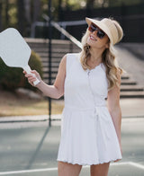 This feminine and flirty dress is the perfect piece to wear on the pickleball court. pale blue scalloping details and tie waist add the perfect touches to this sophisticated silhouette.
