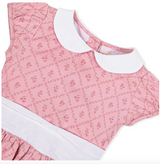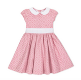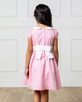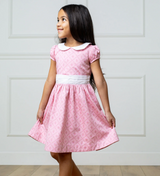 Our adorable dress in soft organic cotton sateen features an adorable peter pan collar to frame her face with simple charm. Features a woven collar, puff cap sleeves, and a pleated waist sash with buttons and bow at the center back. Fully lined in cotton and ready for all those picture taking moments.
