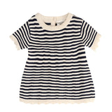 Adorable organic cotton sweater knit short-sleeved baby tunic dress with a beautiful vintage cotton lace knit trim. - Solid navy blue knit bloomer is included. - Button opening in the back. - Mixed navy blue and natural stripe design knit. - Stunning design, comfy, soft & luxurious. - All-season, lightweight, and breathable organic cotton. - Eco-friendly, chemical-free, non-toxic, pure, natural & organic baby clothes. - Ethically produced in India, supporting better livelihoods for small grower farmers. - 100% Organic Cotton.