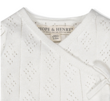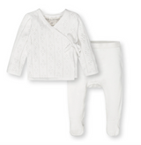 Our sweet matching sweater set in soft organic cotton features a long sleeve kimono wrap top and a cozy footed legging to keep baby warm. A delicate pointelle stitch adorns the top which has small tie closures at the sides. The perfect baby shower gift or heirloom piece for your family.