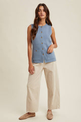 This chic sleeveless sweater vest is the perfect piece for creating effortlessly stylish layered looks. The beautiful textured knit adds visual interest and dimension, while the classic round neckline and functional button details create a timeless silhouette that works for any occasion.