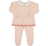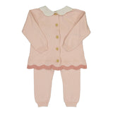 This charming two-piece knit set combines the warmth and comfort your baby needs with the sweet, feminine details that make every outfit special. The beautiful scalloped design and contrasting trim colors create a look that's both timeless and absolutely precious for your darling little girl.
