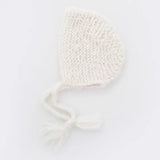 A stunning hand-knit bonnet in the softest angora acrylic yarn has tassel ties. It is a great hospital hat for coming home, perfect for first portraits and makes a great baby shower or hospital gift.