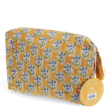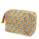 Soft quilted wash bag in yellow, decorated with our Kimaya floral pattern, featuring blue, green and white flowers. The perfect travel companion to organise and carry toiletries and other essentials for holidays, weekend trips, etc.