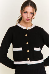 The distinctive gold crest buttons elevate this cardigan from ordinary to extraordinary. These elegant metallic accents add a touch of luxury while the black contrast trim creates beautiful definition and visual interest.