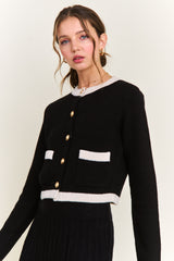 - Black Contrast Trim: Refined trim details that enhance the cardigan's polished appearance