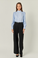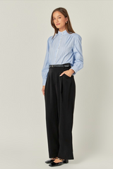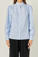 Introducing our stunning Scallop Trimmed Stripe Shirt Blouse a must-have in every fashion-forward woman's wardrobe. Made with a neck stand collar and puffed long sleeves this blouse exudes elegance and sophistication. The sleeve cuffs band and scallop tape trim details add a touch of femininity to this classic top. Perfect for both business and casual occasions this versatile piece will effortlessly elevate any outfit.
