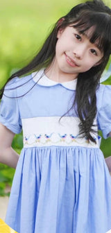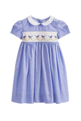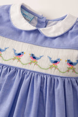 Featuring exquisitely hand-embroidered birds, this dress is a delightful choice for any outdoor occasion. The delicate puffed sleeves and classic white peter pan collar give the dress our signature Annafie silhouette.