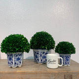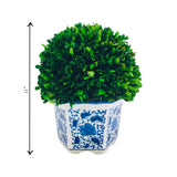 Imagine the perfect centerpiece: a perfectly manicured sphere of preserved boxwood foliage, boasting a lush, emerald hue that never fades. Nestled within a hand-painted ceramic pot adorned with intricate blue and white designs, this topiary brings a symphony of color and texture to your space. The hand-crafted ceramic pot elevates the entire piece. Each pot is uniquely adorned with delicate floral patterns, adding a touch of artisanal charm. More than just a centerpiece, this preserved boxwood topiary makes a thoughtful gift.