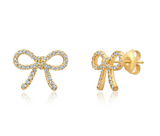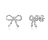 These stud earrings feature bows with handset flawless cubic zirconia, crafted in .925 sterling silver and elegantly finished in pure platinum.