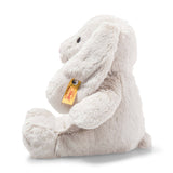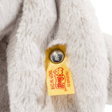 Our skilled artists brought this cuddly bunny to life with an adorable pink nose and extra-long floppy ears. Small beanbags in their bottom, paws and soles allow them to sit in an upright position for collectors' shelves or a kid's table. Safety tested and machine washable, Hoppie Rabbit is an everyday play companion you can give with confidence knowing parents and children alike will adore this light gray bunny plush.