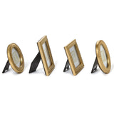 Dimensions: 3 3/4" W x 1/2" D x 4" H, 4" W x 1/2" D x 4" H, 3 1/2" W x 1/2" D x 4 1/2" H, 3 1/2" W x 3/4" D x 4 1/2" H / Laurel Wreath Set of 4 Gold Photo Frames Includes 4 Styles: Round 3 3/4" Dia, Oval 3 1/2" W x 4 1/2" L, Square 3 3/4" Sq, Rectangle 3 1/2" W x 4 1/4" L (stands vertically) - Resin/Glass