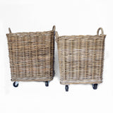 Rattan Square Kubu Grey Storage Baskets on Wheels Introducing our exquisite Rattan Square Kubu Grey Storage Baskets on Wheels. Crafted with premium rattan material, these baskets provide functional storage for firewood or blankets. The timeless design and convenient wheels add an elegant touch to any space. Elevate your home decor with this luxurious storage solution. Sizes available (Length x width x height) in inches: Medium - 13" L x 15" W x 15" H (height with wheels and handles - 19") Large - 17" L x 18" W x 16" H (height with wheels and handles - 23") XLarge - 20" L x 20" W x 22" H (height with wheels and handles - 27") Due to baskets being handmade with natural materials, the size and color of products may vary.