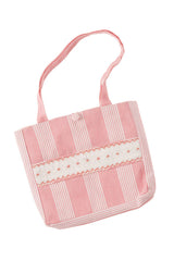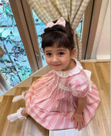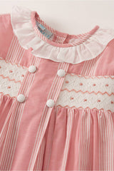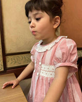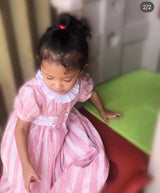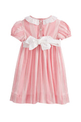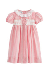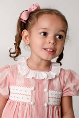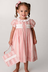 The pretty pink dress has a classic Annafie silhouette with delicate puffed cap sleeves and a white frilled collar. The dress features hand-smocked front waist detailing and four white buttons on the front. Don't forget to pair this with the matching Sidonie bag.