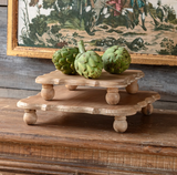 Our Square wooden footed serving platforms are a set of 2. They have an elegant scalloped shape and unique design. Made of sustainable wood, they can be used to display pastries, cakes, and or sandwiches. Definitely a conversation piece.