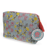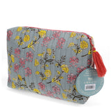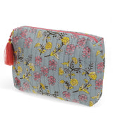 Soft quilted wash bag in blue, decorated with our Lilavati floral pattern, featuring purple and pink together with yellow and green flowers. The perfect travel companion to organise and carry toiletries and other essentials for holidays, weekend trips, etc.