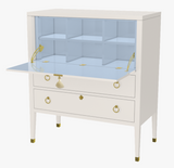 A unique take of a classic secretary desk. Two tone lacquer, tassel details, and elegant hardware, all together make this an elegant desk for bedroom or home office. The front facing door locks with a tasseled key and opens on hinges to reveal a beautiful work space, complete with built in shelves. Chose a vibrant interior to really make a statement. Two lower "soft close" drawers to stow additional items. Exterior color Benjamin Moore White Dove. Interior Color Hinting Blue.