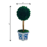 Elevate your home decor with the timeless beauty of the preserved boxwood ball topiary in a stunning blue & white ceramic planter pot.