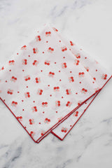 Pattern: Red cherries, bows, and hearts on a Ivory background Red rolled hem finish