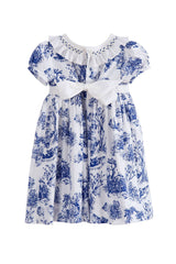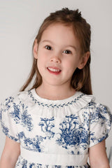 Introducing the Genevieve dress - the perfect fusion of timeless elegance and contemporary style! A stunning addition to our Toile de Jouy collection, this dress is sure to make the wearer the star of the show. With its delicate puffed cap sleeves and crisp white sash tie ready for twirling, this signature dress boasts a classic silhouette and unparalleled luxury. The ruffled collar with delicate embroidery adds a touch of refinement to the already exquisite design. This dress is truly iconic and one of the most luxurious. Our dresses are lined in cotton to create a perfect flare for twirling and dancing like everybody’s watching. The Genevieve has fabric covered buttons that fasten at the back and an attached sash tie at the waist (12 months+).