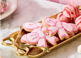 These gold-handled trays features elegant bow details and comes in two sizes, offering versatility for various serving needs. Made from durable aluminum, these trays are perfect for food presentation or as stylish accents on your table. They are food safe and add a touch of luxury to any occasion.