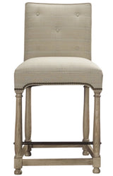 The Marit Stools with their turned columns and capital arches reflect English and Arabic architecture. Columns and stretchers adorn the base along with an Antique Bronze stretcher with eight sides that terminates with turned raised beeded elements that is mounted above the front turned wood stretcher. An intergral part of the design is the hand-buttoned curved shape of the back that has been trimmed with an applied side border that is repeated surrounding the seat and is finished with standard NP-08 nail head trim. Dark Walnut is the standard finish. Optional Weathered Stone paint with NS-05 nail head trim shown.