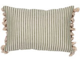 This pillow features Mathis Ticking Stripe with a knife edge finish on top and bottom. Printed on a linen-hemp blend with a running-stitch detail, Mathis Ticking Stripe in sky is an interesting, textural take on traditional mattress ticking. Sides are finished with Berber Cotton Tassel fringe. Pillow includes a feather/down fill insert and hidden zipper closure.