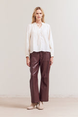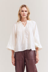 The graceful silhouette creates a feminine, sophisticated look that flatters every body type. The flowing design provides comfortable movement while maintaining the structured elegance that makes this blouse so versatile.