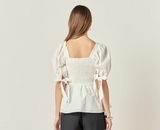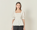 This top features a flattering peplum hem and has a stretchy smocked bodice so it shapes to your body. The puffy sleeves feature beautiful bow ties that add a feminine flair to the top. Made of breathable cotton this top is perfect for wearing throughout the seasons. You can style it with a mini skirt during the summer and then with jeans and a long coat during the colder months.