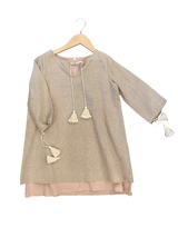 the autumn dress is a long sleeve dress in a natural linen with light pink lining. embroidered star details on the front.