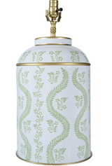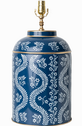 New style chinoiserie tole lamp in navy or spring green. Highly decorative and traditional design. Includes harp and finial.