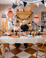 Bring your Halloween party to life with our vintage-inspired hanging characters! These spooky decorations add a playful retro vibe to any space. Hang them from doorways, windows, or ceilings for an instant festive atmosphere that will delight guests of all ages. Perfect for creating that classic Halloween feel with a modern twist! • includes 3 unique characters • 1 - pumpkin with tissue arms and legs • 2 - pumpkins with jointed limbs • approximately 36" tall • includes twine for hanging